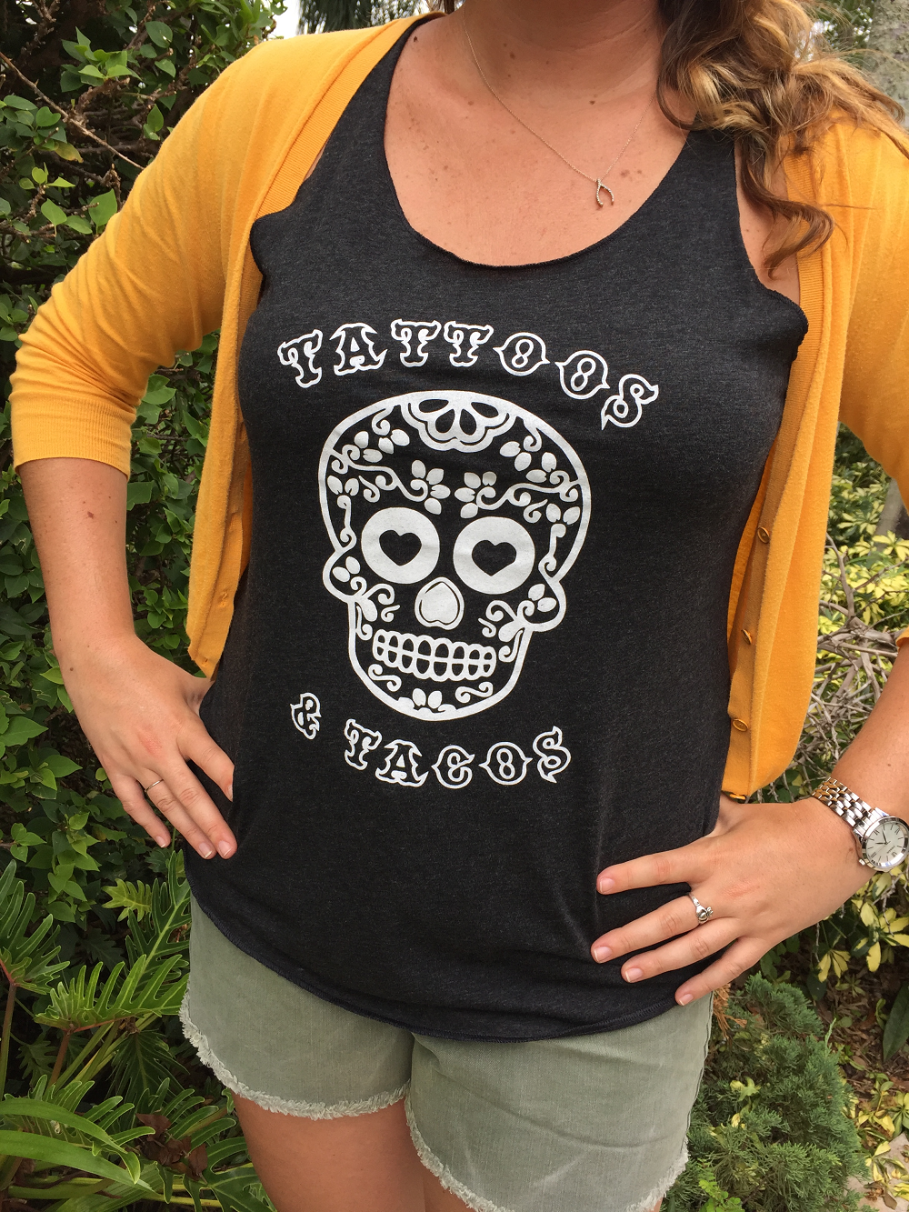 Tattoos & Tacos! Who doesn't love either of these things??! This triblend racerback tank is made from 50% Polyester, 25% combined ring spun cotton and 25% rayon. This fabric is incredibly soft with a great drape, stretch and recovery.